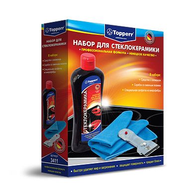 Набор для ухода за стеклокерамическими поверхностями Набор предназначен для эффективной очистки и бережного ухода за стеклокерамической поверхностью плиты. Используя данный набор, Вы легко справитесь с любым загрязнением, сохраните первоначальный блеск и продлите срок эксплуатации поверхности Вашей плиты на многие годы. В состав набора входят: Высокоэффективное средство с силиконом для ухода за стеклокерамическими поверхностями, 300 мл